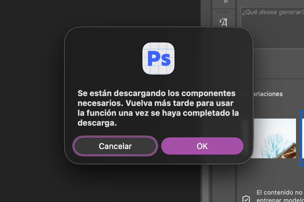 GGiselaCarusoParticipantForum|Forum|3 months agoNovember 19, 2025Error en la herramienta "Quitar"Forum|Forum|3 months agoNovember 19, 2025返信数 1.27 ビューHola! Hace semanas que no puedo utilizar la herramienta Quitar en Ps 2025 y Ps Beta. Me dice que se están descargando componentes, ya reinicie el equipo y sigue igual. Tengo una imac M4 16GBMe ayudan?Gracias!macOS