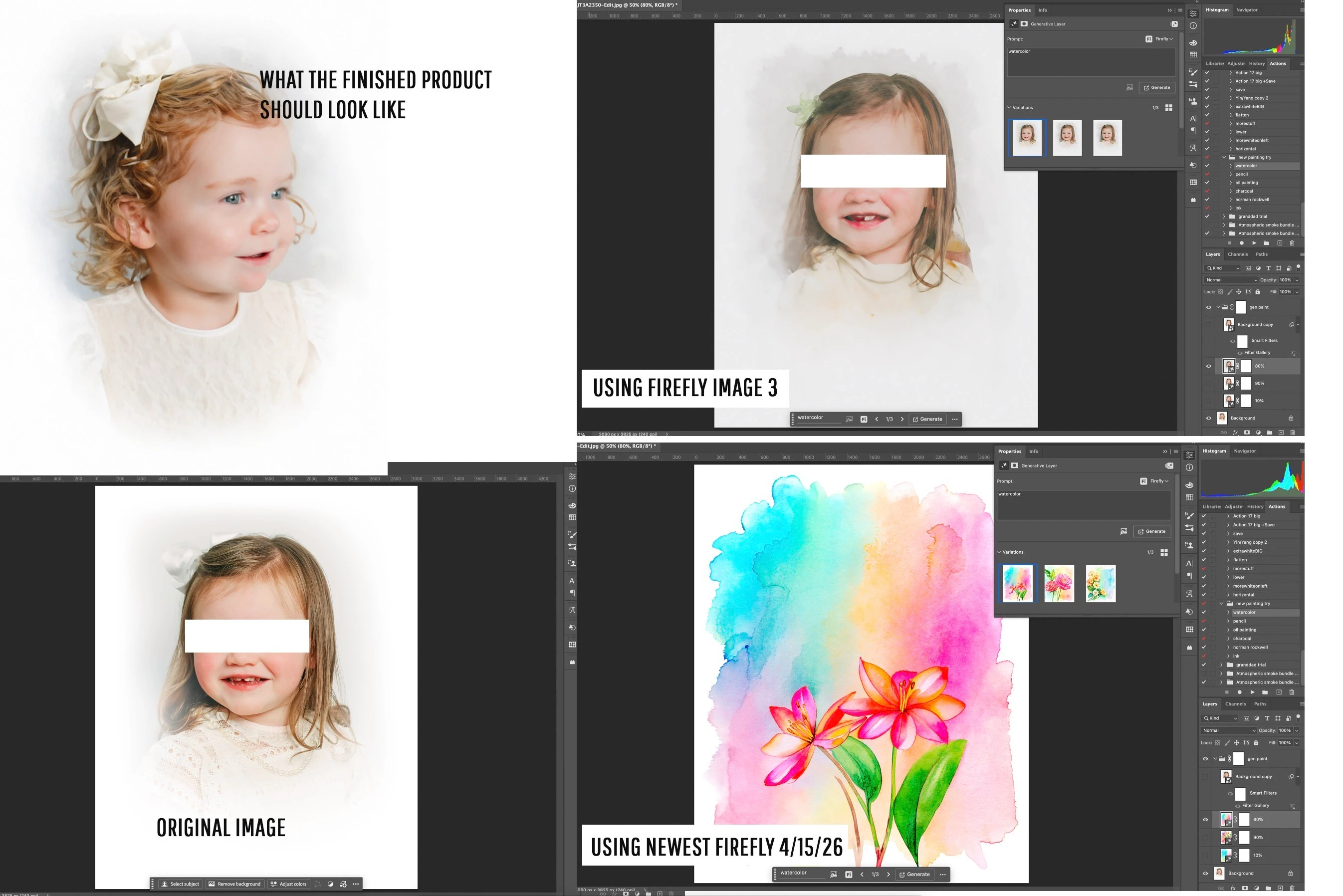 Last week, Gen Ai using firefly was fine. This week it is not considering the subject when using the prompt. Support was no help. This morning I tried to remove a white cord laying against a cream colored wall. I selected the area around it and first tried no prompt. It gave me a green sword instead . I then tried cream colored wall . It gave me three more green swords. Remove worked on this but not others. I find the remove in LR to be better. What I really need it for is an action I’ve built that helps me paint out digital paintings. I make several layers with different channels and it builds different versions of the image. I then mask away the parts I like. In the screen shot you can see what it looks like as the final version in the past, what the little girl should look like, how the newest version of firefly handles the same prompt, and then how it looks when I revert back to firefly image 3 . Still not as good as it was.
