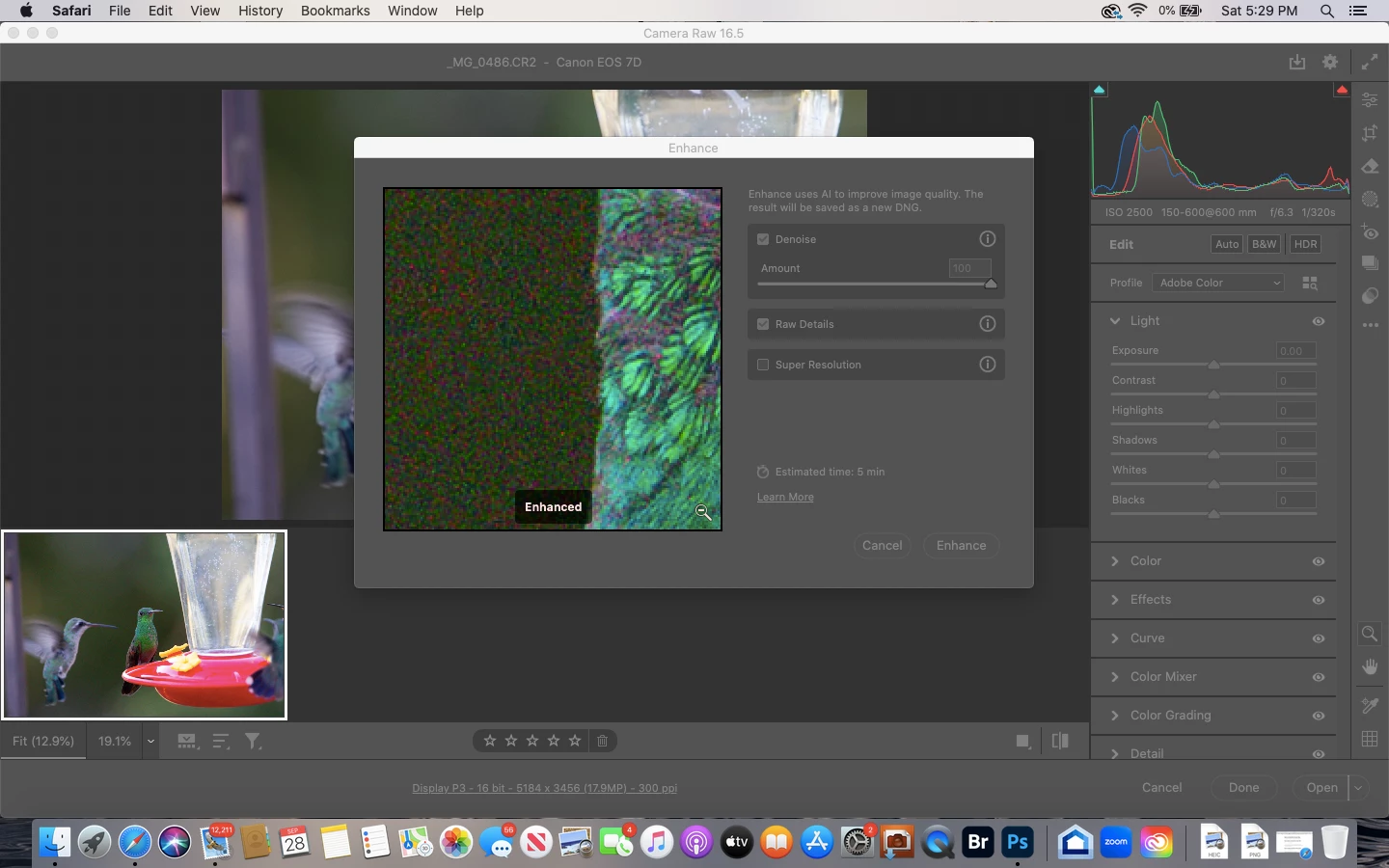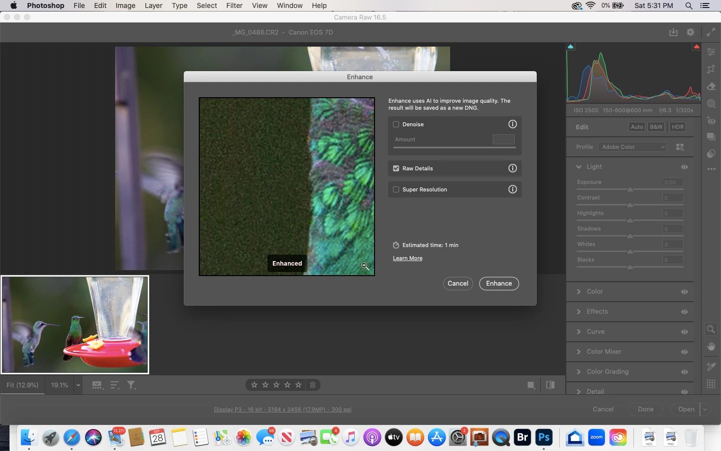 I am a consistant user of Adobe Photoshop, and just today I discovered the existance of the photo enhancement feature. However, my exitment did not last because the denoise tool, included in this feature, increased the color noise of the image severely instead of reducing the noise. When I turned off the denoise, the image returned to normal. Thinking that this may have only been a visual glitch, I clicked the enhance button to create the new enhanced dng image with the denoise on. Unfortunately, Photoshop failed to create the new image all together.