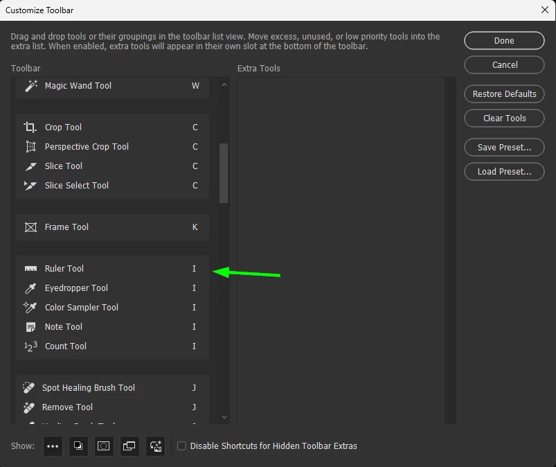 At one time I needed to use the Ruler Tool a lot and I wanted it to be the first by default so that I could select it quickly.
