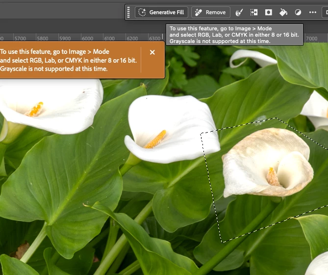 I wanted to use generative fill on a selection, but PS refused because it said my color image was in grey scale. Flat wrong. Below are screenshots of the image mode and the bad message.