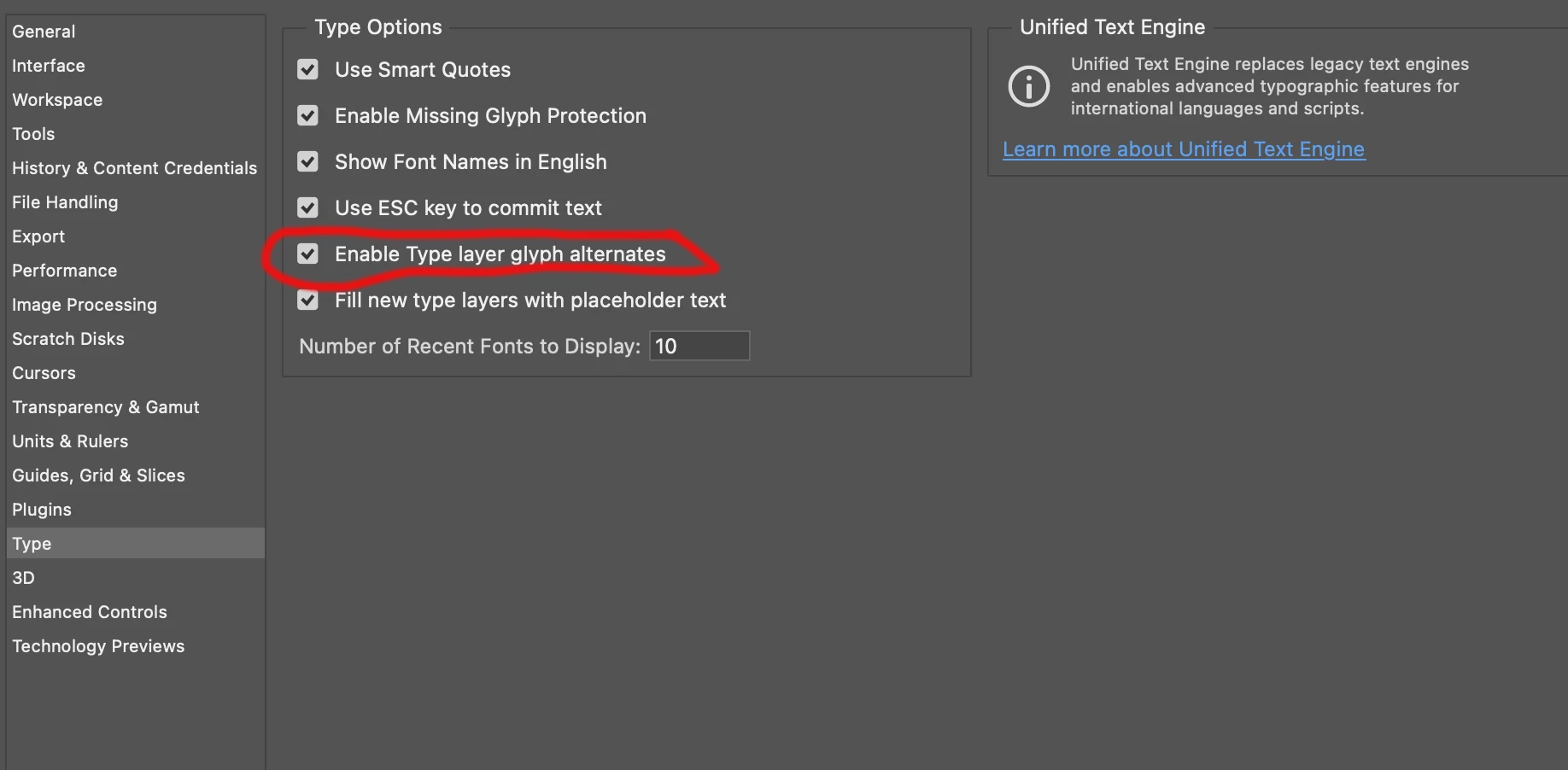 I am using Photoshop 24.0.0. When I use the font Leander Script Pro Bold (a script font), alternate letters show when I rollover the letter, but when I try to choose an alternative, it doesn't change. I opened the file in Photoshop 23.3.2 and it worked just fine.