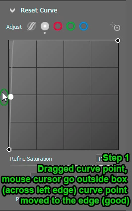 1. in ACR curves when you drag curve point and move mouse across left or right edge of curves box nothing happens, but when you drag curve point and move mouse across top or bottom edge of curve box curve point disappears! and if you let go mouse when its outside the box curve point will just get deleted.