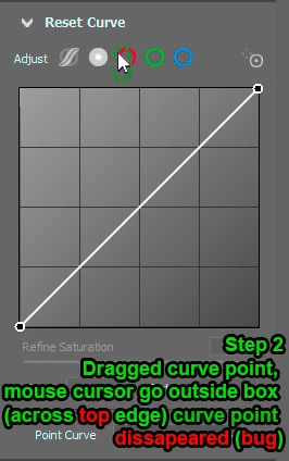 2. Same bug in Photoshop curves adjustment layer when dragging curve point and mouse go across the curve box (any edge) curve point disappears.