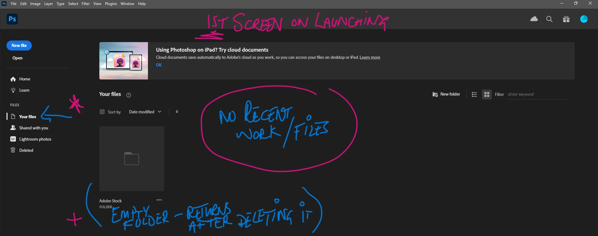 First screen which opens on launching PS is "Your Files".  It does not open on HOME, but every option is empty anyhow.