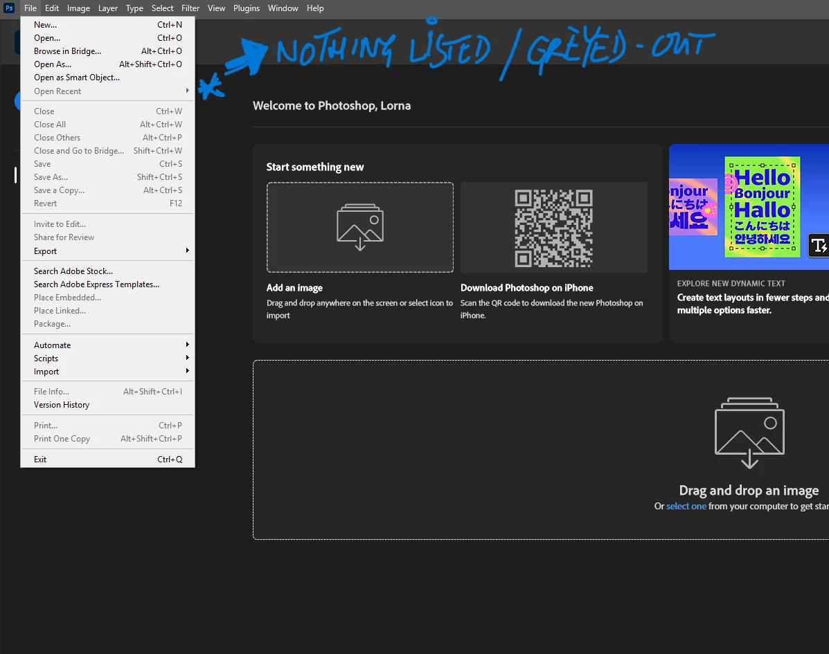 1. When you open the File > Open Recent menu in Photoshop, do you see any files listed there? = NO