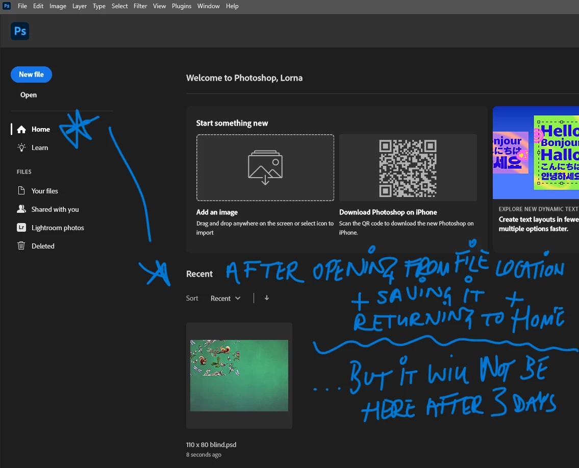 3. After opening a local file in Photoshop, does the file show up on the Home screen or under File Open Recent? = BOTH, ONCE OPENED FROM FILE LOCATION, BUT GONE WITHIN 3 DAYS.