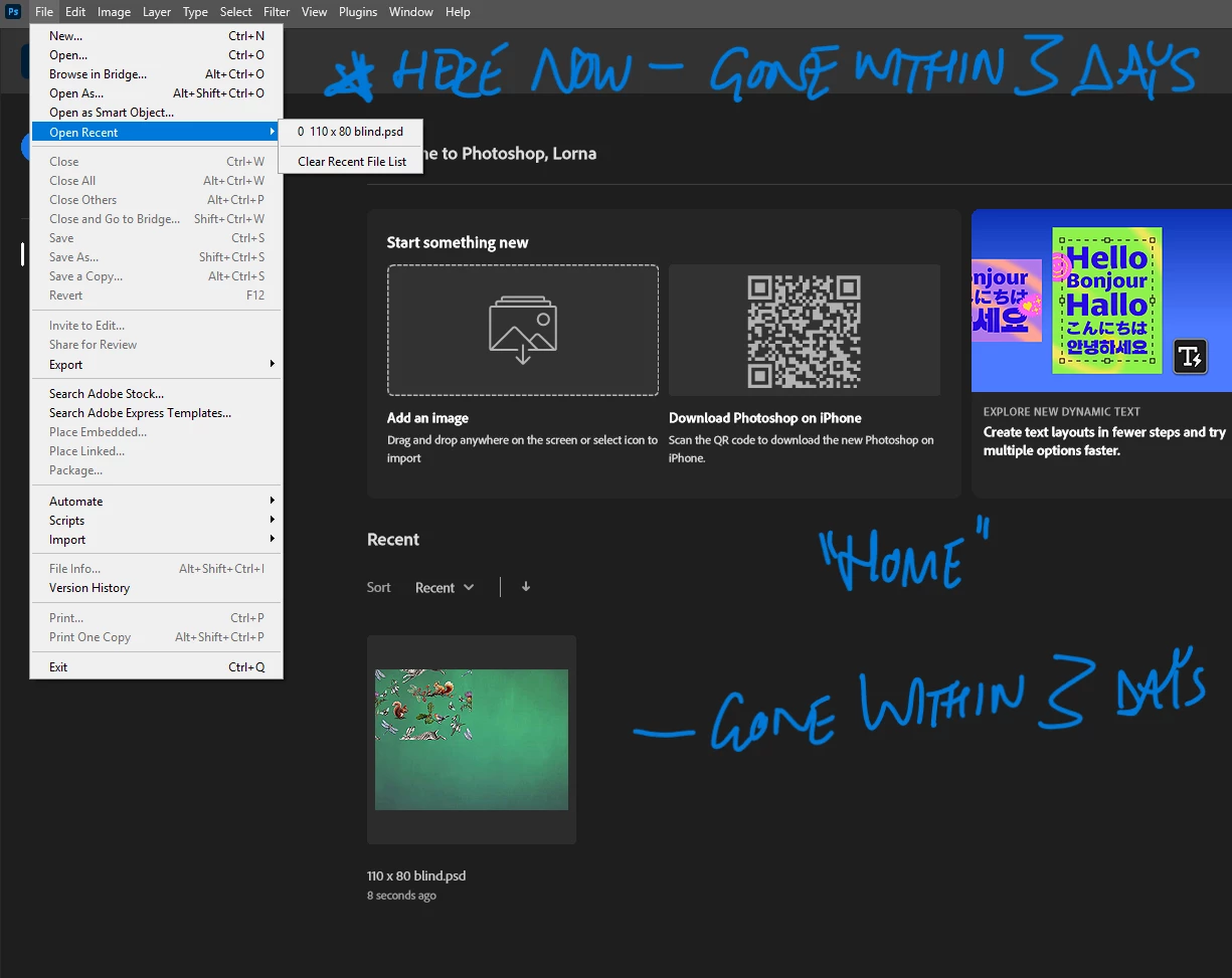 Recent File seen after opening it from folder location, saving it and returning to "Home" - it is there and the menu list shows it too. But both will be empty within 3 days. I worked until 2:30am last night/morning and what I was working on has disappeared from PS Recent and Home views. I have used an example file for purposes of sharing now and it is there because I opened file location, saved file and returned to Home. But it will be gone within days.