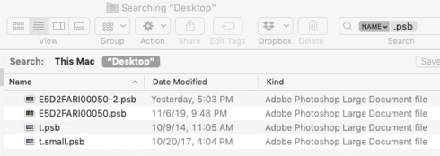 With this change, Spotlight will no longer find files of type Adobe Photoshop Large Document (PSB) that were created by versions 20 and earlier. This will mystify users, who won't understand why Spotlight isn't finding their files. For example, Finder shows these four files with extension .psb, two created with 21 and two created with 20 or earlier: