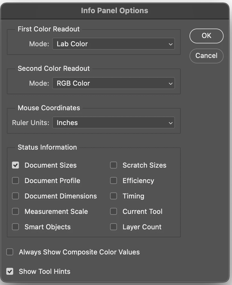 • Select Lab color in the drop-down list in the color dropper icon just beside the R,G and B values in the Info tool: