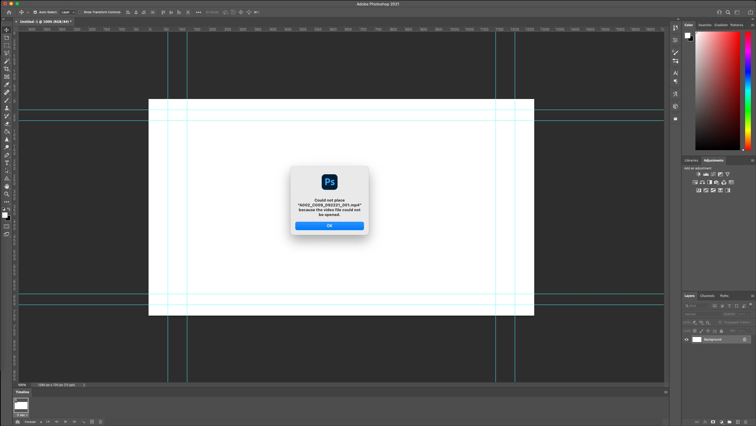 I am using 22.5.0 version. Basically I tried to insert video (.mov or.mp4) into Photoshop and create gif, however it keeps prompt this window saying that the format isn't support. No matter video duration is from 1sec to 10sec, OR file size from 300kb to 5mb, it doesn't work at all! Does anyone having the same issue? thanks
