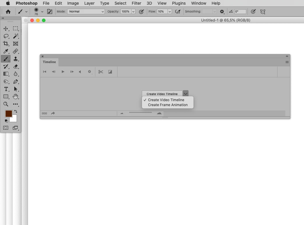 I am not able to select anything but "Create Frame Animation" in the Timeline. I am trying to create a Video Timeline, but not using Frame animation. This option isn't in the bottom left or top right of the Timeline menu.