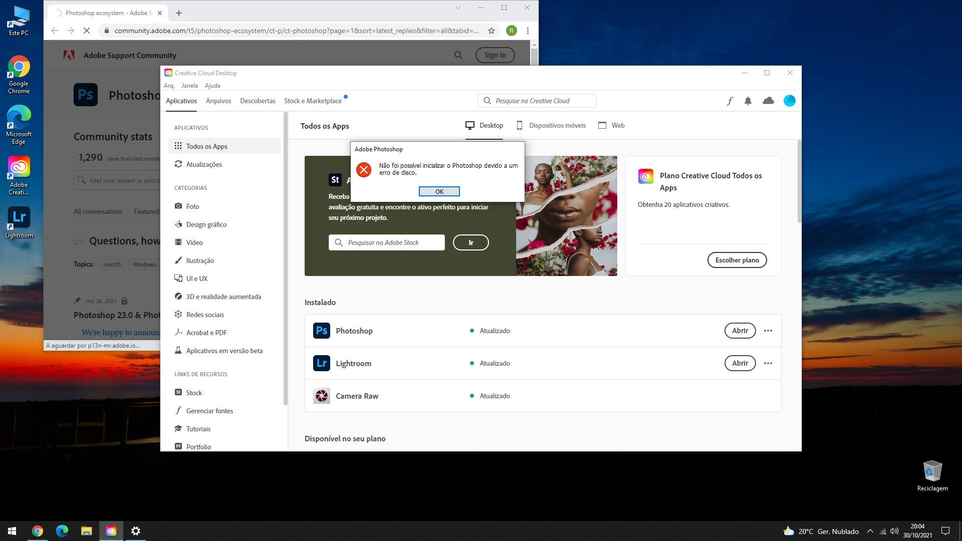 tenia instalado PS 2021 ayer lo actualice a PS 2022 y al abrirlo me da este error " NO SE PUEDE INICIALIZAR PHOTOSHOP PORQUE HABIDO UN ERROR EN DISCO"