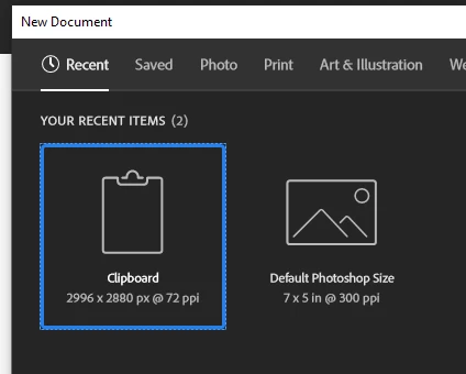 When I select "clipboard' as the new document size it instead creates a 300 dpi, 7 x 5 inch "default photoshop size."