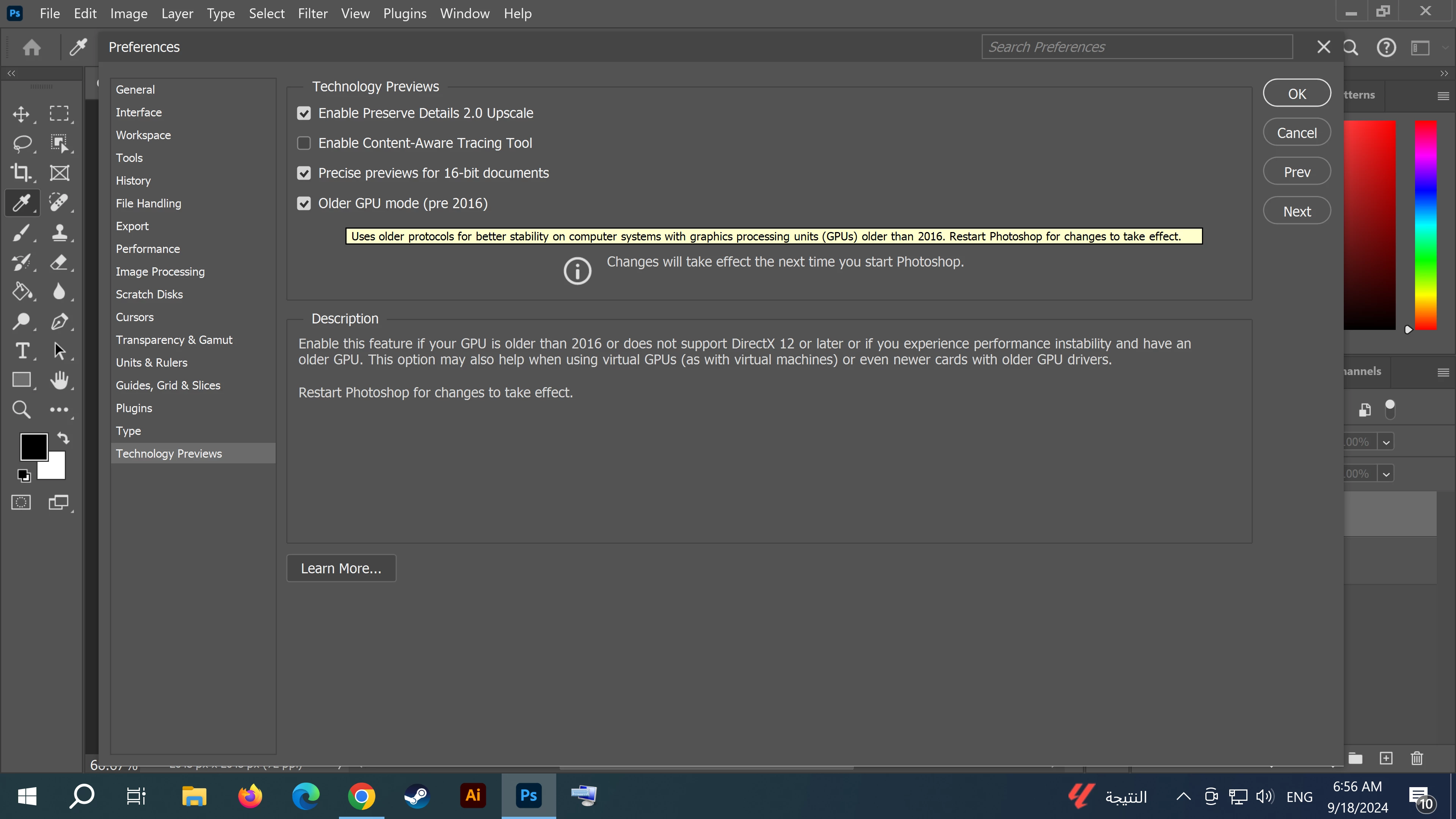 I was experiencing the same issue while using Photoshop 2024, at first i tried unchecking "use Graphics processor" from the performance tab,  and it was fixed however I know that this can affect my overall experience with PS, then i came across this fix in Technology Previews tab I checked "Older GPU mode (pre 2016)" since I am using Geforce GTX 1060 6GB GPU card which was released in 2016. and the issue was resolved without having to disable my graphics card use in PS.