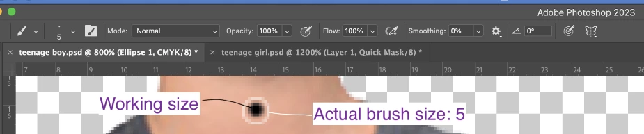 4. Now the size of the brushstroke and the diameter of that surrounded circle in Photoshop doesn't match any more.