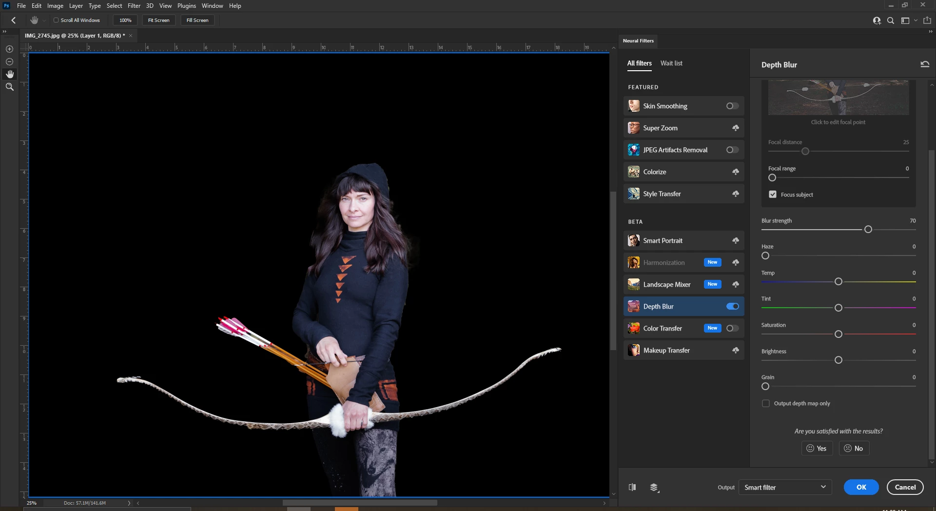 Any time I try the Depth Blur neural filter, I get black background instead of blur - you can see in my screenshot what it looks like at 70% blur strength. This result happens no matter where I have the strength slider. I have yet to see any actual results.