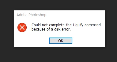 Al utilizar hoy photoshop y seleccionar el filtro licuar me da el siguiente mensaje: "No se ha podido completar el comando licuar porque ha habido un error de disco".