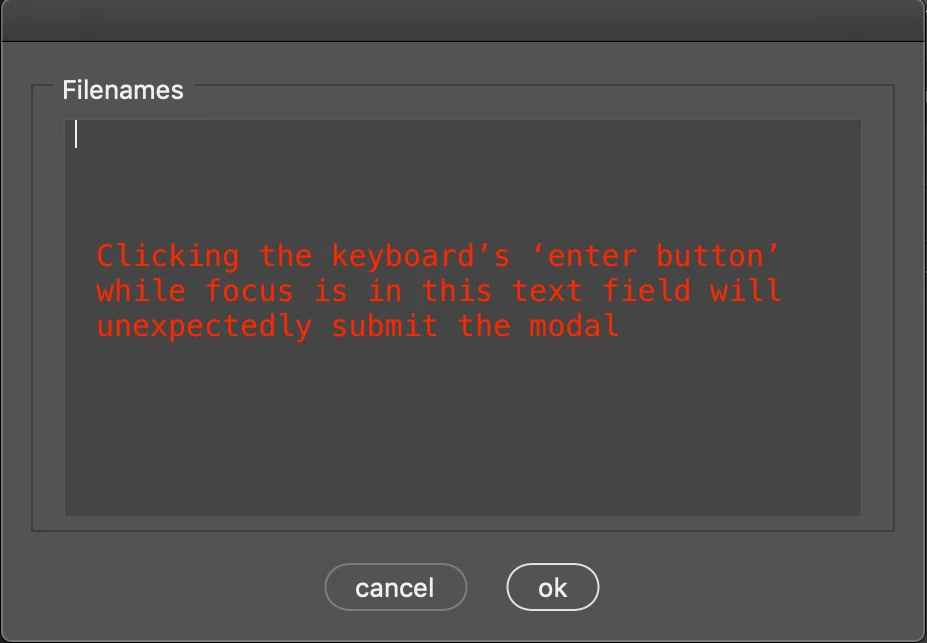 The enter key in the simplified test code below is not allowing users to create a new line within the edit text field (as expected). Instead, the modal is being submitted. The code works properly on OSX but not Windows.