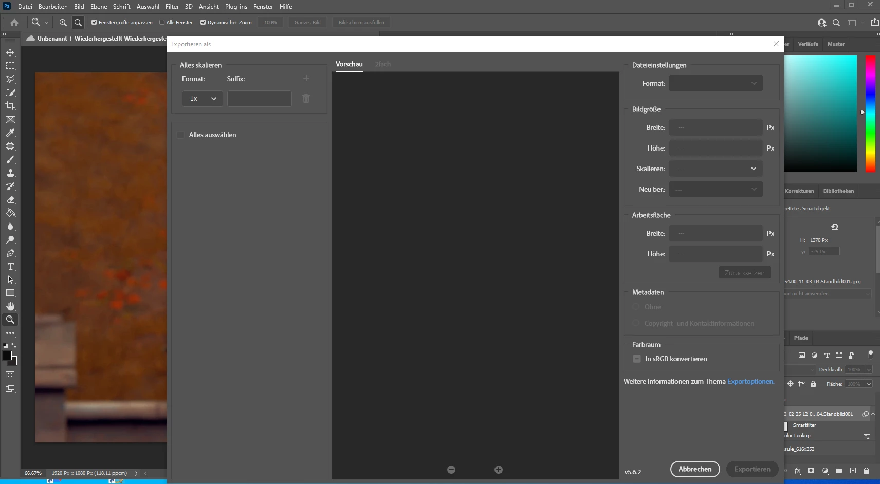 I'm having the issue where my Export doesn't work. Export As doesn't load the graphic, Quick PNG Export does nothing - neither give any error message nor any never-ending load screen.