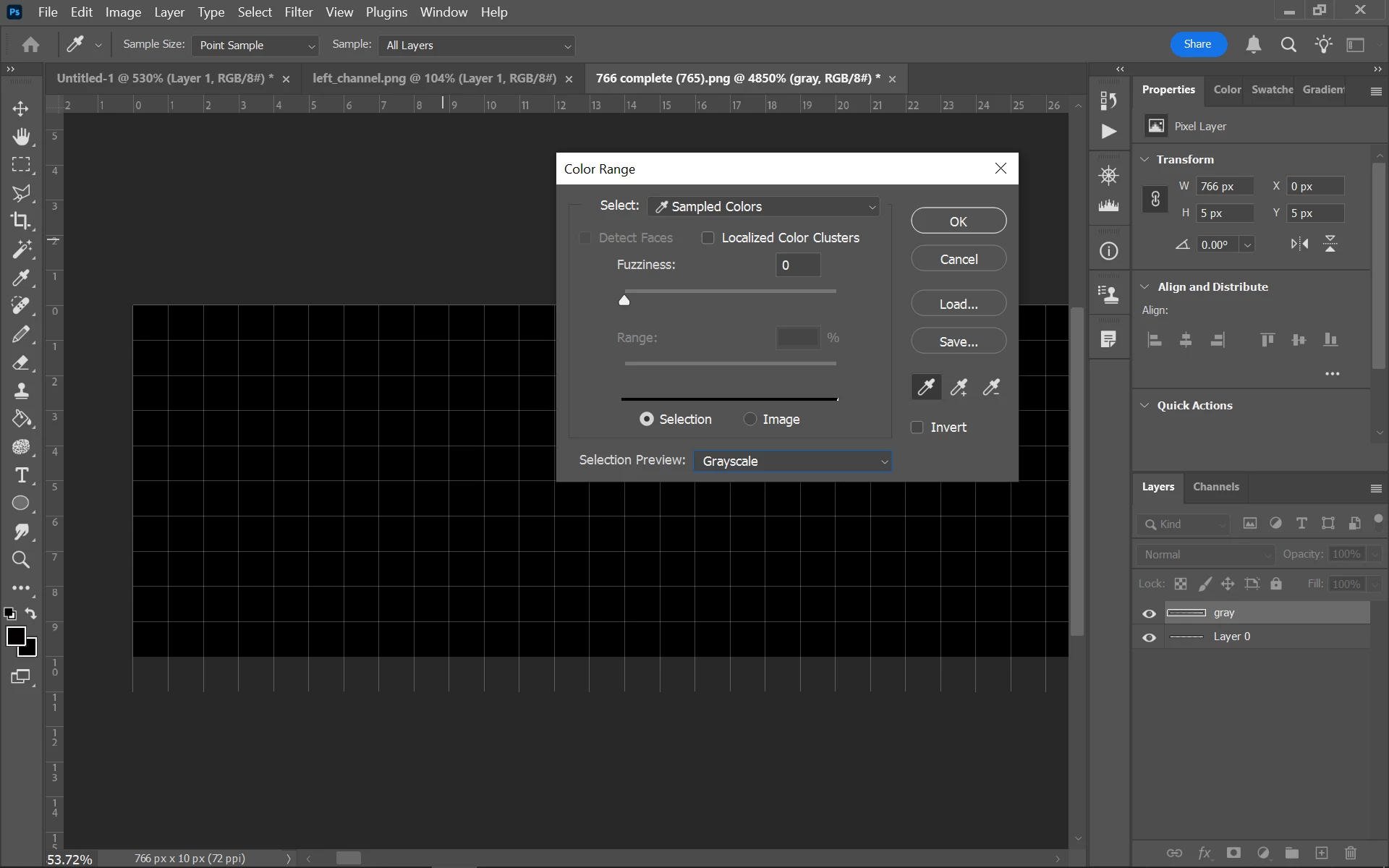 This bug occured when I had open an image with a resolution of 766 px by 10 px, and I was working in the typical 8-bit RGB colorspace. I had the pixel grid enabled, and I was zoomed in at 4853.72%. I opened the Color Range selection tool, and when the selection preview was set to "Grayscale", an extra row of the pixel grid appeared underneath the image, without a bottom edge. None of the other selection preview options engender this visual error.