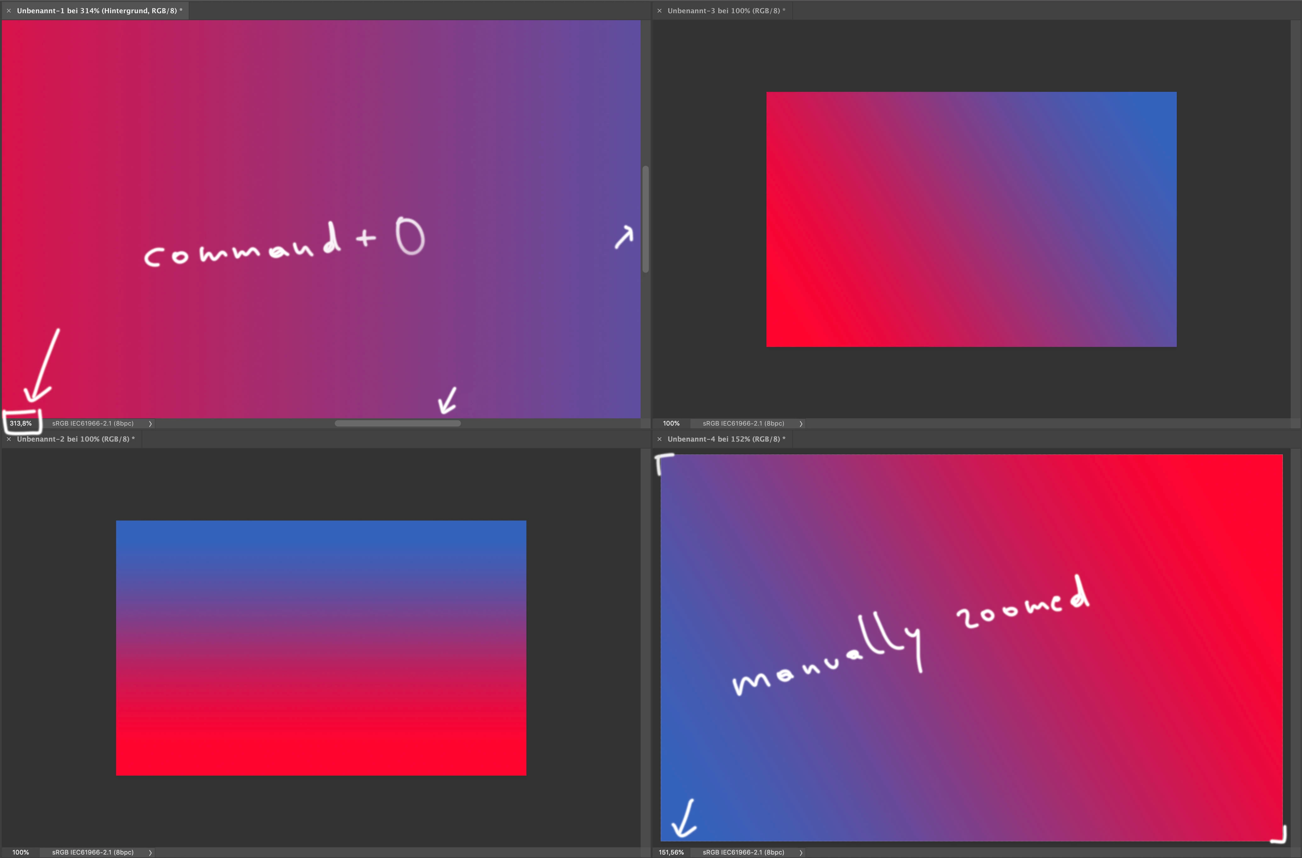 When you now hit Command+0 on one of the documents it zooms to 313 % which is the same as it would do when you only have one document visible on your screen. Which means that the document is displayed a lot too big for the currently given window. I mean yes the command is titled "Fit on Screen" and actually it's still fits on the screen, but nonetheless that's an awkward behavior. I would expect Photoshop to be smart enough, so that it zooms to about 151 % so that the document fit's to the window (like in the manually zoomed example > lower right-hand corner: