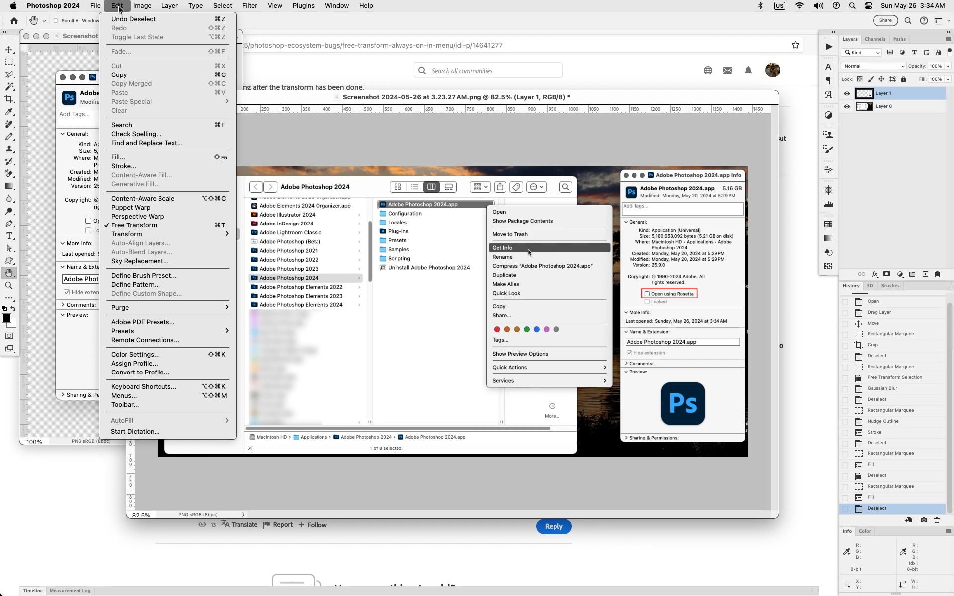 Free Transform in the Edit menu is always checkmarked like it's in use, even when I am not transforming anything. I can be doing anything in Photoshop, and it always stays checked as if in use.
