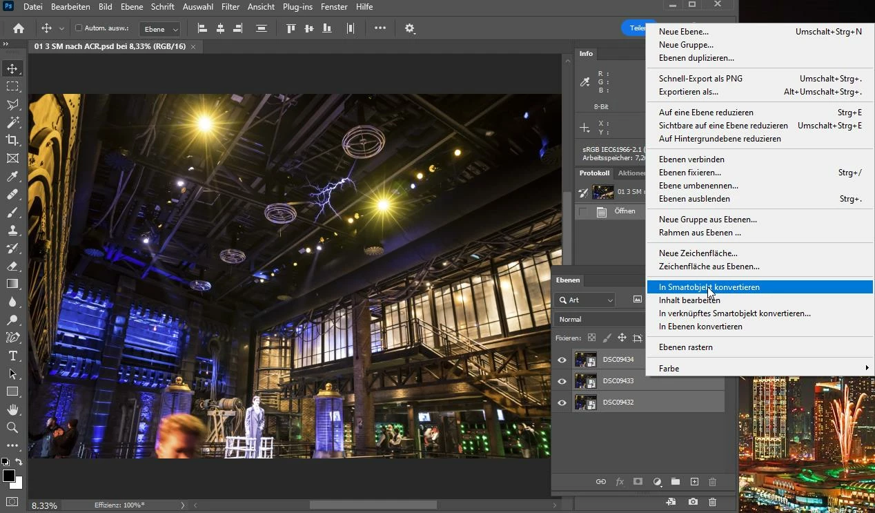 - I open from ACR 3* RAW files from a Sony camera as smart objects in Photoshop and arrange them as layers in one image.