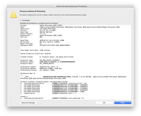 Yesterday I installed the most recent version of macOS Catalina (10.15.3), I was using the 10.15.2 I guess (or the previous of the one I installed). Since yesterday I can't open Photoshop 2020. As soon as I click on the icon the window of "unexpected quit" appears as you can see in the image (It's in Italian). I've tried to uninstall and install again the app and tried to install an old version of Photoshop (I'm currently using the 21.1) but nothing changes. Have anyone experienced the same? How do I solve this huge problem? I wanted to run the app through the terminal, maybe that could help, but I don't know how to.