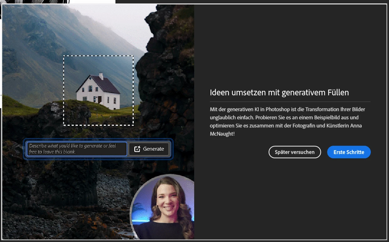 Immer wenn ich Photoshop öffne erscheint das gleiche Bild mit einem Haus in den Bergen, einer Lady, die mir etwas erklären möchte und der Hinweis "Ideen umsetzen mit generativem Füllen" - siehe Anlage. Kann mir bitte jemand sagen, wo ich das abschalten kann und generell Werbung in meiner Programmversion verhindern kann? Ich finde einfach keinen "Ausknopf". Besten Dank. Wolfgang