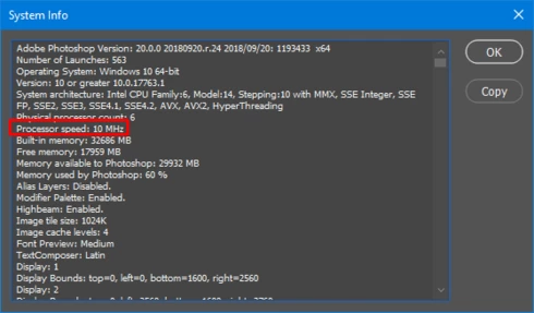 Некоторые пользователи Photoshop CC 2019 неправильно отображают частоту процессора в информационном окне о системе.
