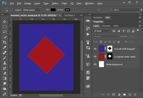 - B (A alt shift dragged): A pixel layer filled with blue, with a vector mask that is the result of Alt+Shift dragging the vector mask from layer A to layer B. This Alt+Shift dragged vector mask works in B as if it was in Substract mode, showing blue outside of the mask. But in the mask thumbnail it's shown the same as the vector mask from layer A (white inside, grey outside), and if inspected with the path selection tool, it shows also as being in Combine operation mode (but it's working as if it was in Substract mode).