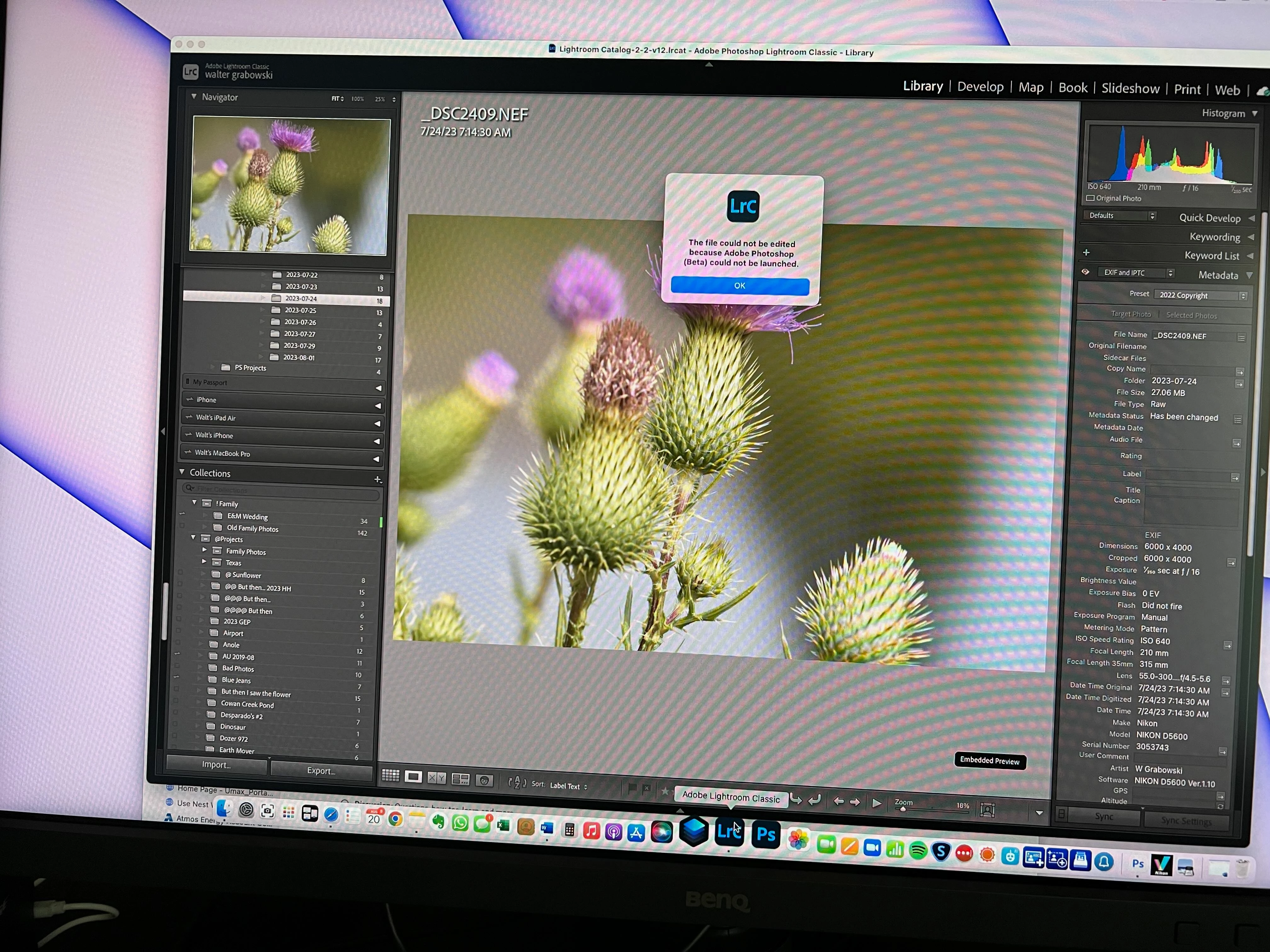 If I then select 'OK' in the error message the image immediately opens in Photoshop and I can work away.