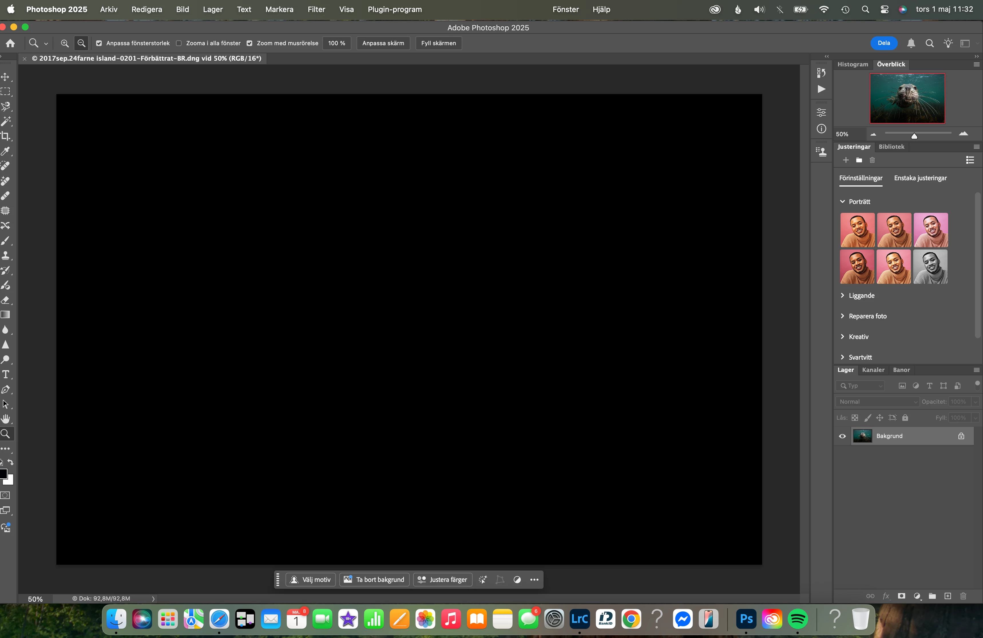 When I select "edit image in Photoshop" from Lightroom and the image opens in Photoshop, it is completely black. It appears OK at a "Overview"  and as a Background but not in the large editing window, which means I can't edit it. I've googled without finding any solution. Same problem even if I open another image or restart the computer and program. The programs are also updated to the latest versions. Yes, I'm a rocky on Photoshop so the problem is probably very simple... Does anyone have any suggestions??