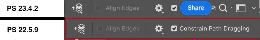 I'm attaching a screenshot of the UI for the Direct Select tool showing the difference btwn PS 23.4.2 with Share button and PS 22.5.9.  –  Not an exact match, but shows the how the Share Button sits on top of the Direct Select Options in the UI.