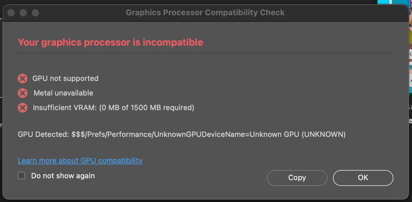 P: Photoshop 25.0 Graphics Processor Compatibility Check fails: Unknown GPU