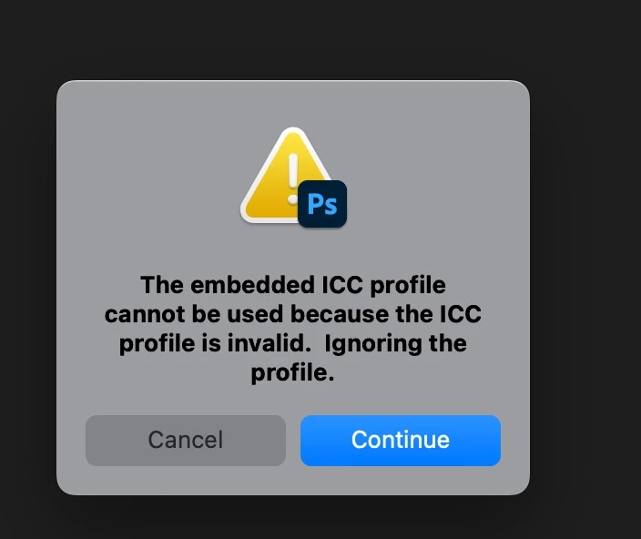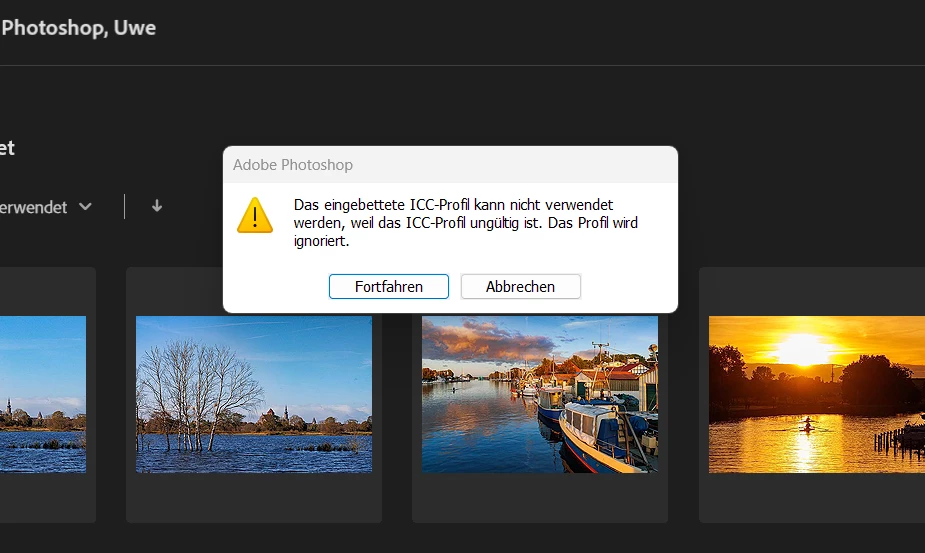 Wenn ich eine Datei in Camera Raw bearbeitet habe und sie dann in Photoshop (Version 25.0 ) öffnen will bekomme ich folgenden Hineis: "ICC-Profil kann nicht eingebettet werden weil das ICC-Profil ungültig ist. Das Profil wird ignoriert."