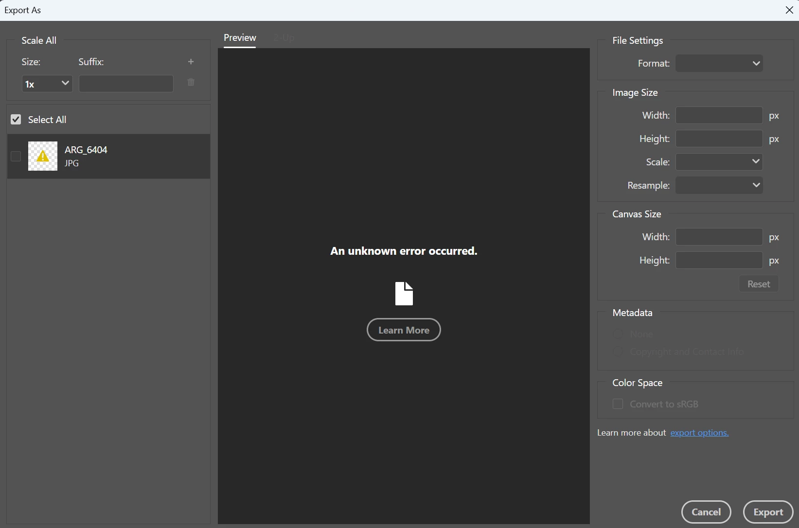 P: Photoshop 27.4 (GA) Export As says "An unknown error occurred."