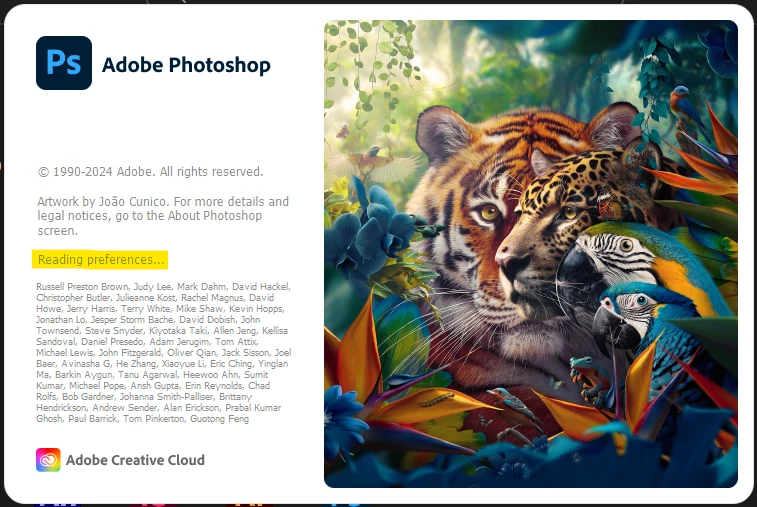 Hi there!  Yesterday my Photoshop 2024 stopped opening.  It stalls at the jungle animal photo.  I've reinstalled twice from the cloud and still nothing.  I also uninstalled the Beta just in case that was it.  I'm out of ideas.  Please help. :). I see the files in my Finder on the mac.