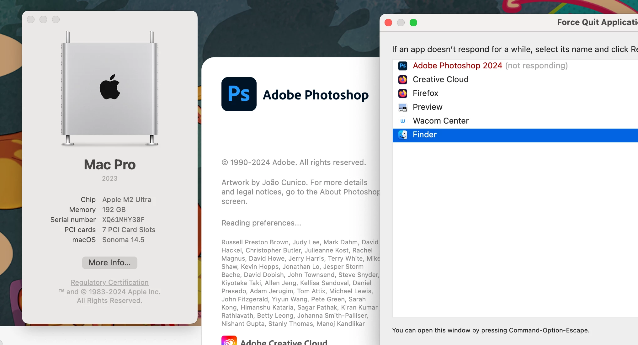 PhotoShop 2024 freezes/crashes on opening on my Mac Pro running Sonoma. Have tried contacting Adobe for help but have received no support or help at all. At this point wishing I had not subscribed.