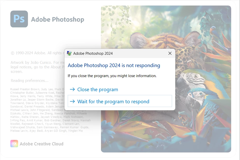 I've been recently facing this issue, and as mentioned I've done everything. My Photoshop version is 2024. All other Adobe software is working just fine but Photoshop or Photoshop Beta is not opening, the loading screen pops up, but several times it was getting sucked on " Loading Fonts List" then the recently it got stuck on " Reading Preferences " and it stopped responding. Also, one time it showed "Catch in IPhotoshopApplication: class std::bad_alloc : bad Allocation" My storage is sufficient, and my RAM/ memory of my system is also functioning, but why am I not able to open any version of Photoshop, I can't find out. Looking for a solution, I've tried updating, reinstalling, deleting all my settings and preferences and opening but I couldn't find a fix.  Please I need desperate help for this problem.