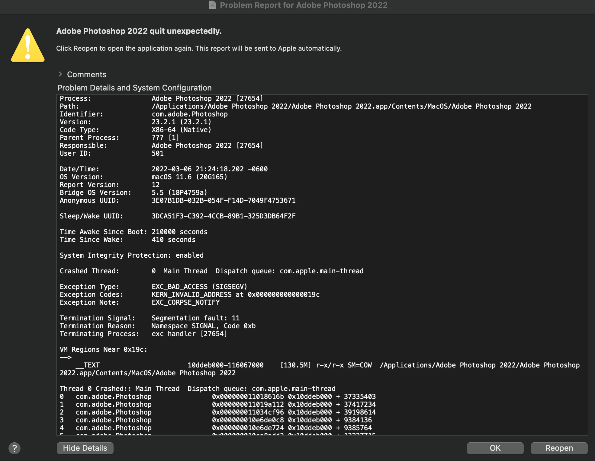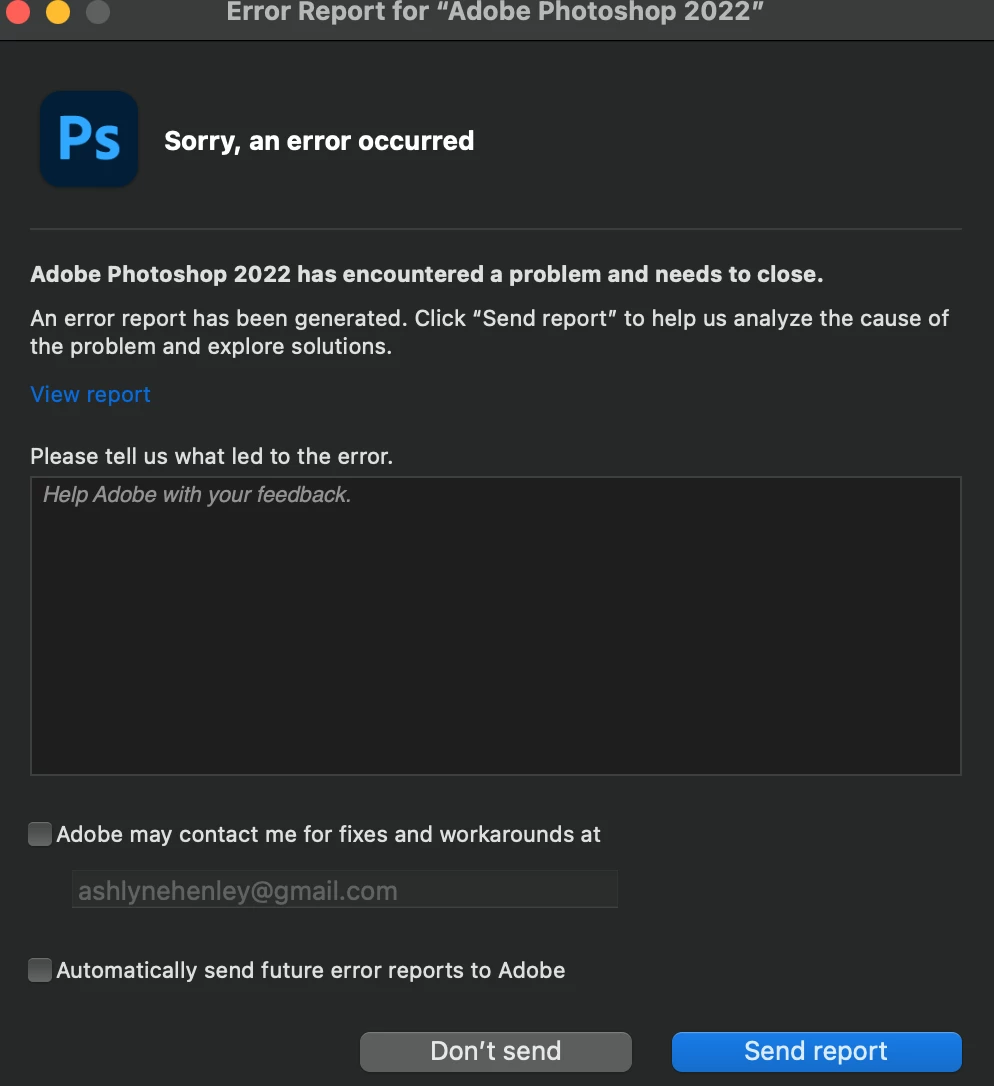 When I am using Photoshop 2022 on MacOS Big Sur, I don't typically have to deal with too many errors. However, I recently discovered a bug that has been more than just an inconveience. Everytime I select the crop tool by hitting "c" on my keyboard, and try to exit by hitting the cancel button, Photoshop crashes. I don't know how to fix this, it only does this when I use the keyboard shortcut. I typically lose an hour or more of work, and as an animator, this is unacceptable. What can I do to fix this, and if I can't, I need Adobe to look into this bug. Attatched below are the error messages I receive after rebooting the program.