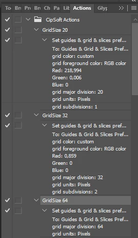 I've got several actions that switch my grid parameters in Photoshop. I noticed with the latest Photoshop version, that running actions that do not contain an entry for subdivisions lead to Photoshop freezing. In the example in the screenshot, the actions GridSize 20 and GridSize 32 work fine, but running GridSize 64 leads to a freeze every time. I tried narrowing it down, and setting the grid color has no effect, but once you leave out the setting for subdivisions in the action, the crash occurs.