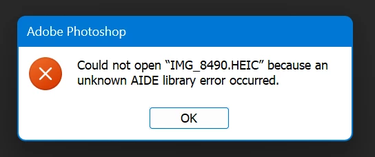 P: Photoshop HEIC files Could not open <filename> because an unknown AIDE library error occurred.