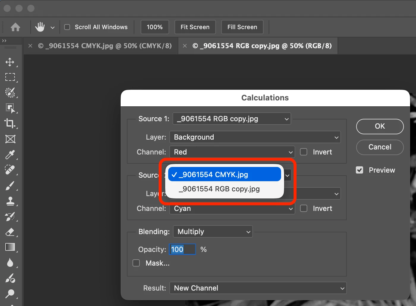 Using Image calculations in Photoshop 27.4.0 does not allow me to select second open identical image except for the colour space as a source, one is set to RGB the other (a copy) is set to CMYK in version 27.3.1 this works I've reset my preferences , restarted photoshop and disabled graphics card option still does not work…