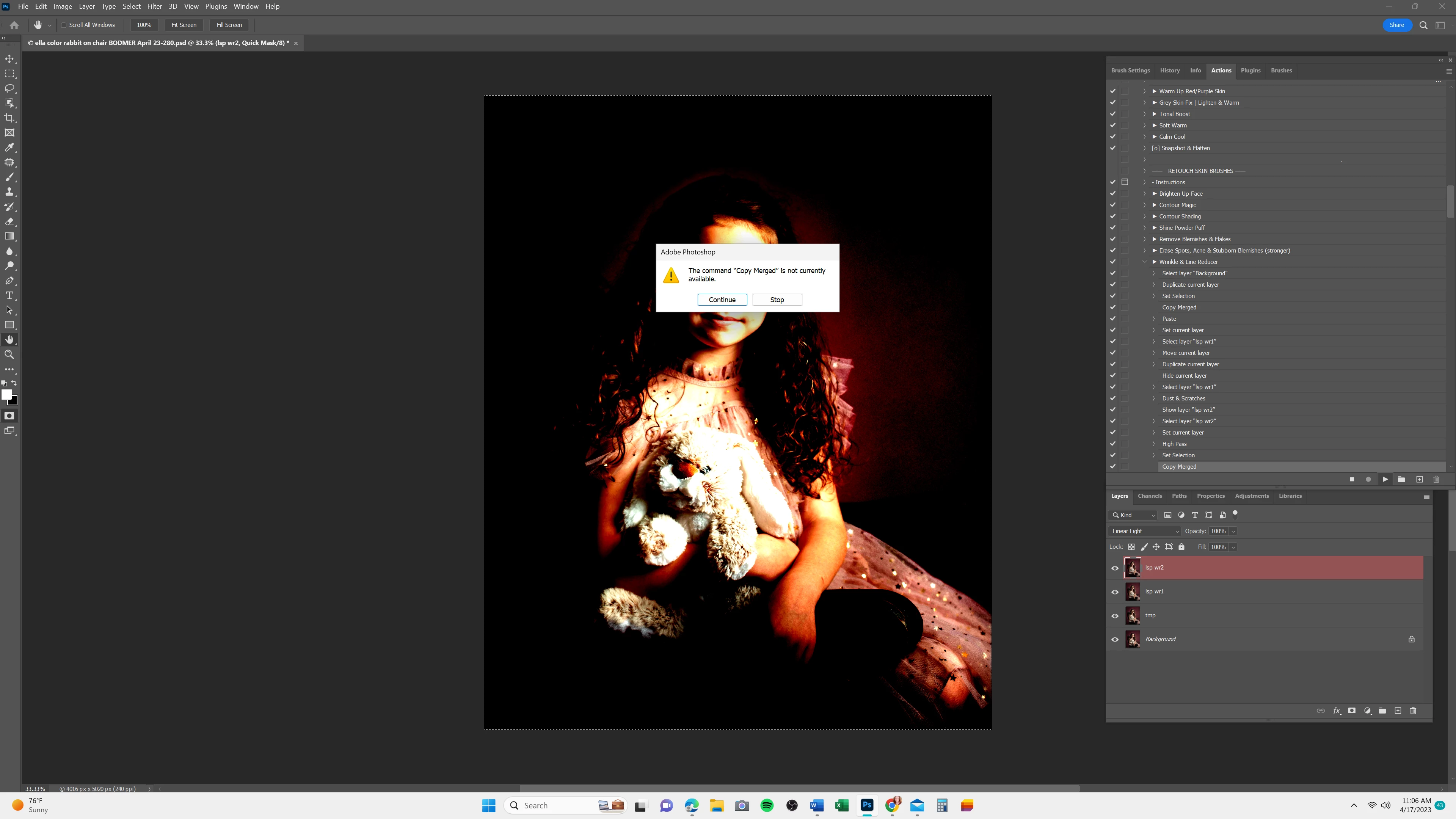 I am trying to run actions that I use everyday and never had trouble with.  Today, I tried to run two actions and they won't work.  When I press play, the action starts the process and then I get a popup that says "the command 'copy merged' is unavailable" or something like that, and stops the whole process.  Please help!