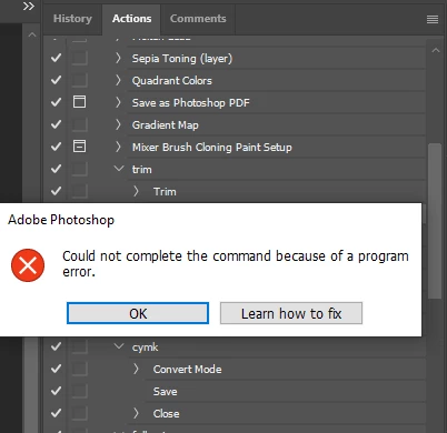 I have been using a  simple batch to make minor changes to JPEGs for many years.  It was working correctly up until quite recently, but now it has just started to give an error on the 'save' for (as far as I can see) no reason!  The prompt that comes up takes me to a page to 'fix' the issue, but it has nothing relevant on the webpage.