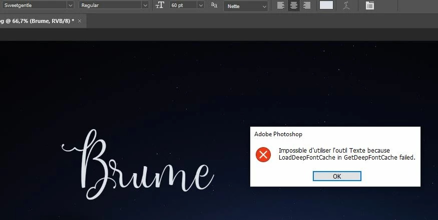 Bonsoir , j'ai un problème avec le choix de police sur Ps , il affiche qu'une police si l'on fait dérouler le menu pour afficher d'autre polices un méssage d'erreur apparaît . Avez-vous eu le problème et comment le corriger ? Merci