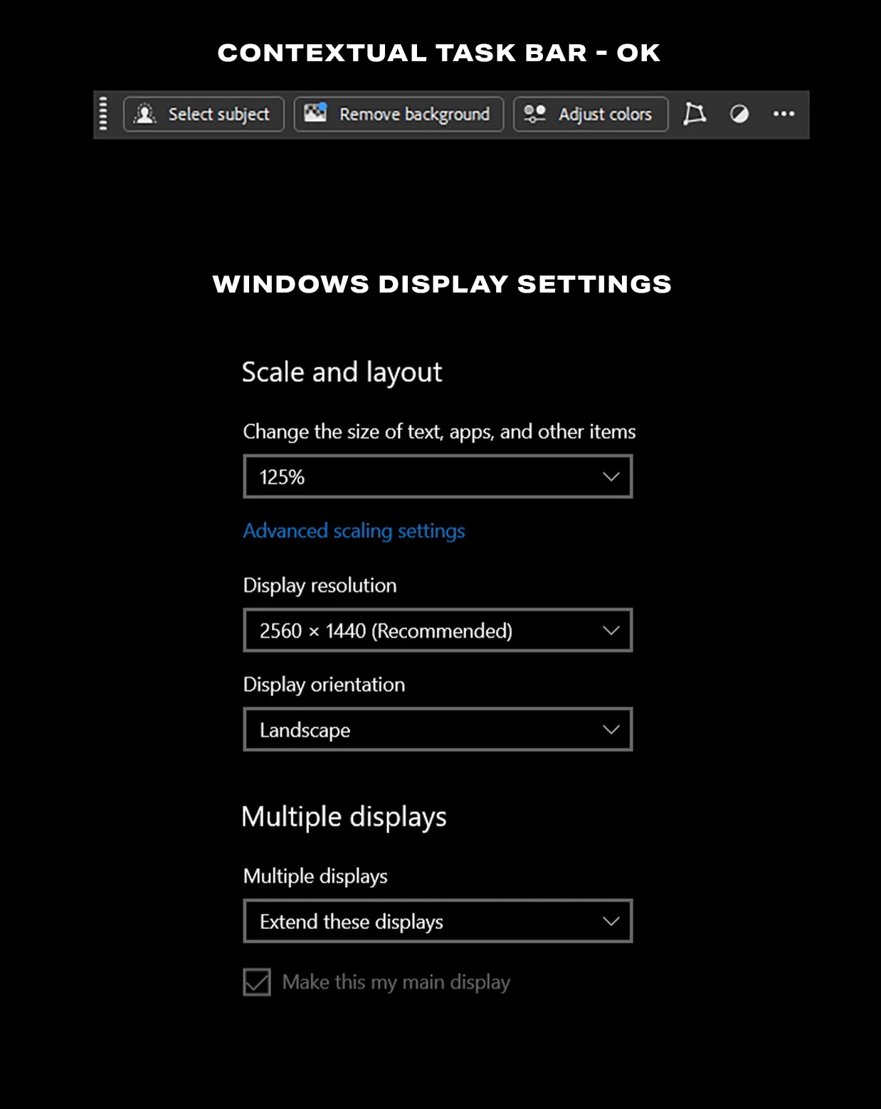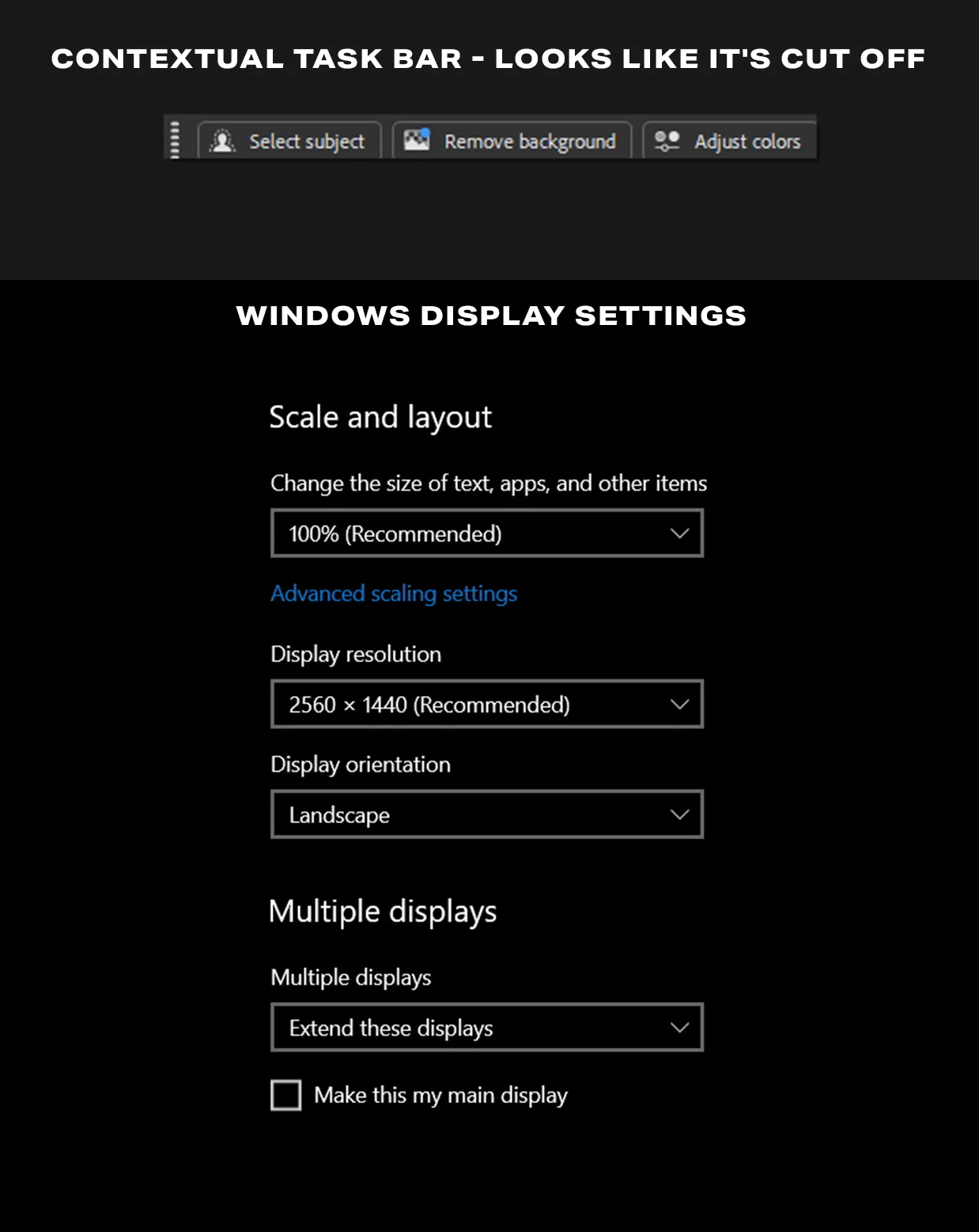 Hello. The context task bar in Photoshop v.26.8.0 is not fully displayed (looks like it's cut off), the other panels are fine. This bug is observed at a monitor 27" with resolution of 2560 x 1440px, scaling 100%. (this problem was not observed on the monitor 24" Full HD). Changing the settings of the Photoshop interface parameters does not change anything. Resetting the program settings also does not change anything. System Windows 10 x64 22H2, GPU RTX3050 with the latest driver for now NVIDIA Studio Driver 576.80. Any ideas?