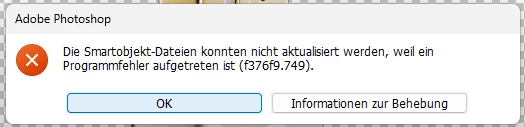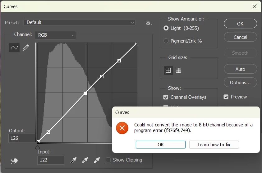 Photoshop 2026 (v27.4) on Windows gives me this error constantly when work with curves (i didn't try other tools, so i hope this is the only one): "Impossible to update advanced objects because a program error has occurred (f376f9.749)".